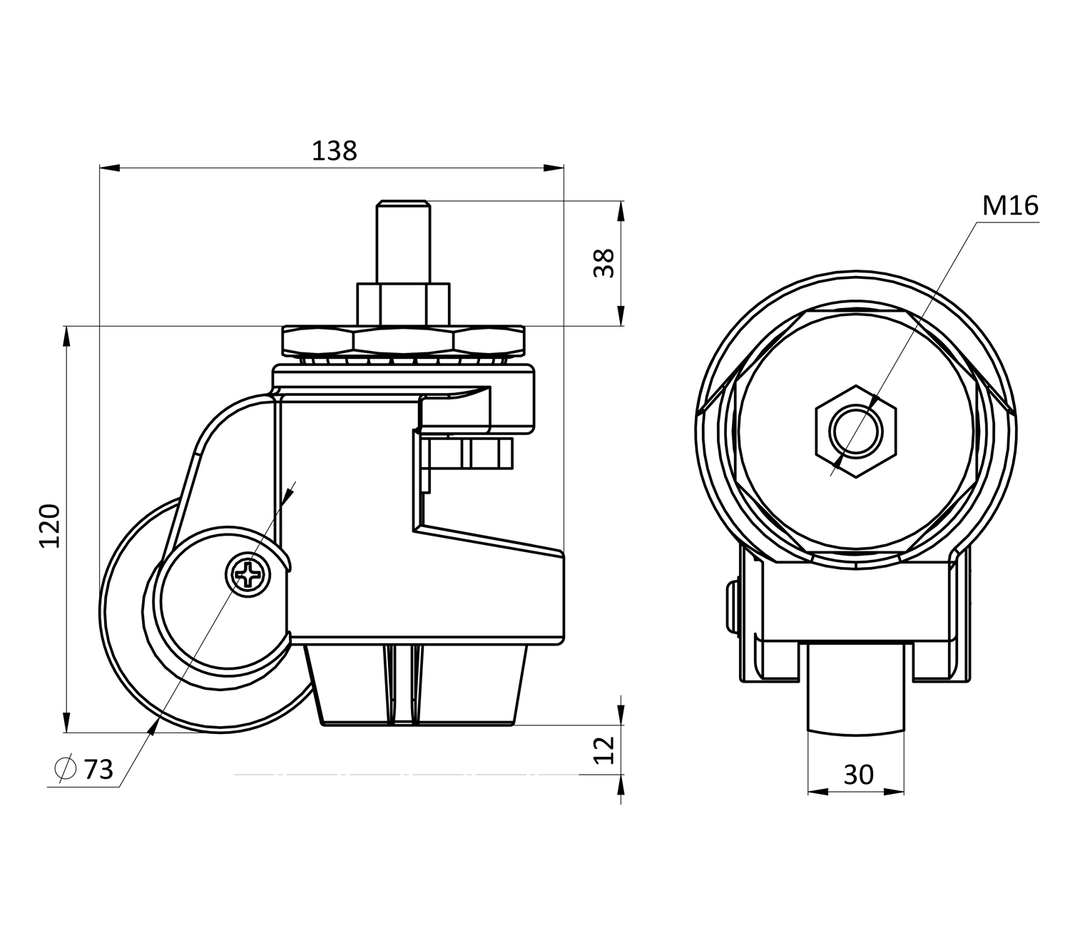 Колесо самоустанавливающееся H 120 мм, D 73 мм М16, нагрузка до 750 кгКолесо самоустанавливающееся H 120 мм, D 73 мм М16, нагрузка до 750 кг