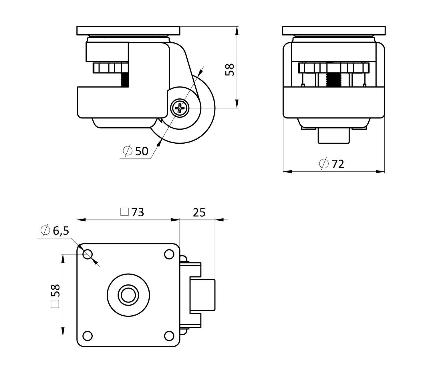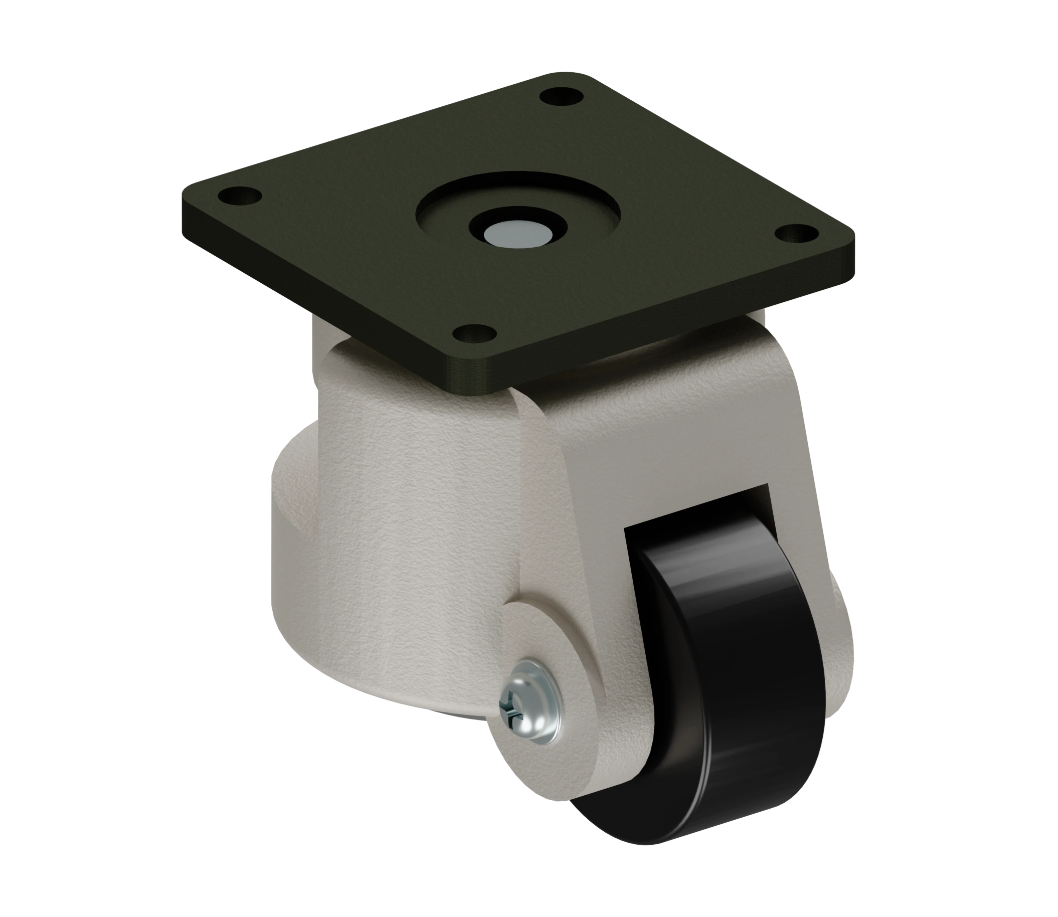Поворотный ролик диаметром 50 мм с опорой. Кронштейн изготовлен методом литья из сплава алюминия с порошковой окраской бежевого цвета. Фиксирующая опора выполнена из твердой резины. Применяется при производстве специализированного оборудования со специальными требованиями выставления конструкции по высоте. Выставление высоты производится сзади при помощи встроенного регулировочного колесика. Легкий ход обеспечен материалу ролика при движении на гладкой поверхности пола.