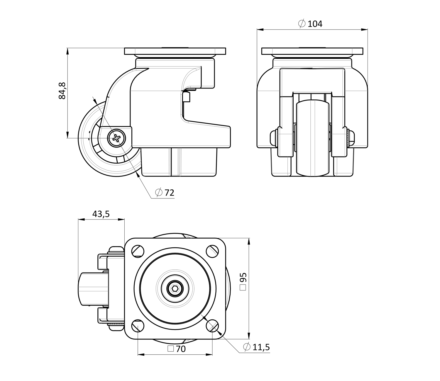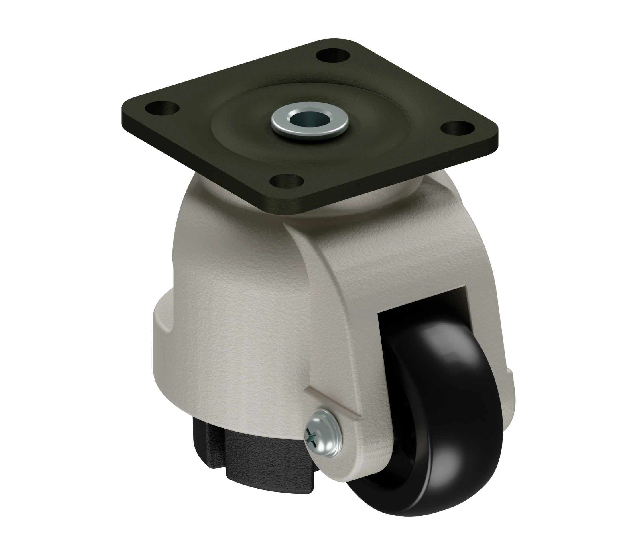 Поворотный ролик диаметром 72 мм с опорой. Кронштейн изготовлен методом литья из сплава алюминия с порошковой окраской бежевого цвета. Фиксирующая опора выполнена из твердой резины. Применяется при производстве специализированного оборудования со специальными требованиями выставления конструкции по высоте. Выставление высоты производится сзади при помощи встроенного регулировочного колесика. Легкий ход обеспечен материалу ролика при движении на гладкой поверхности пола