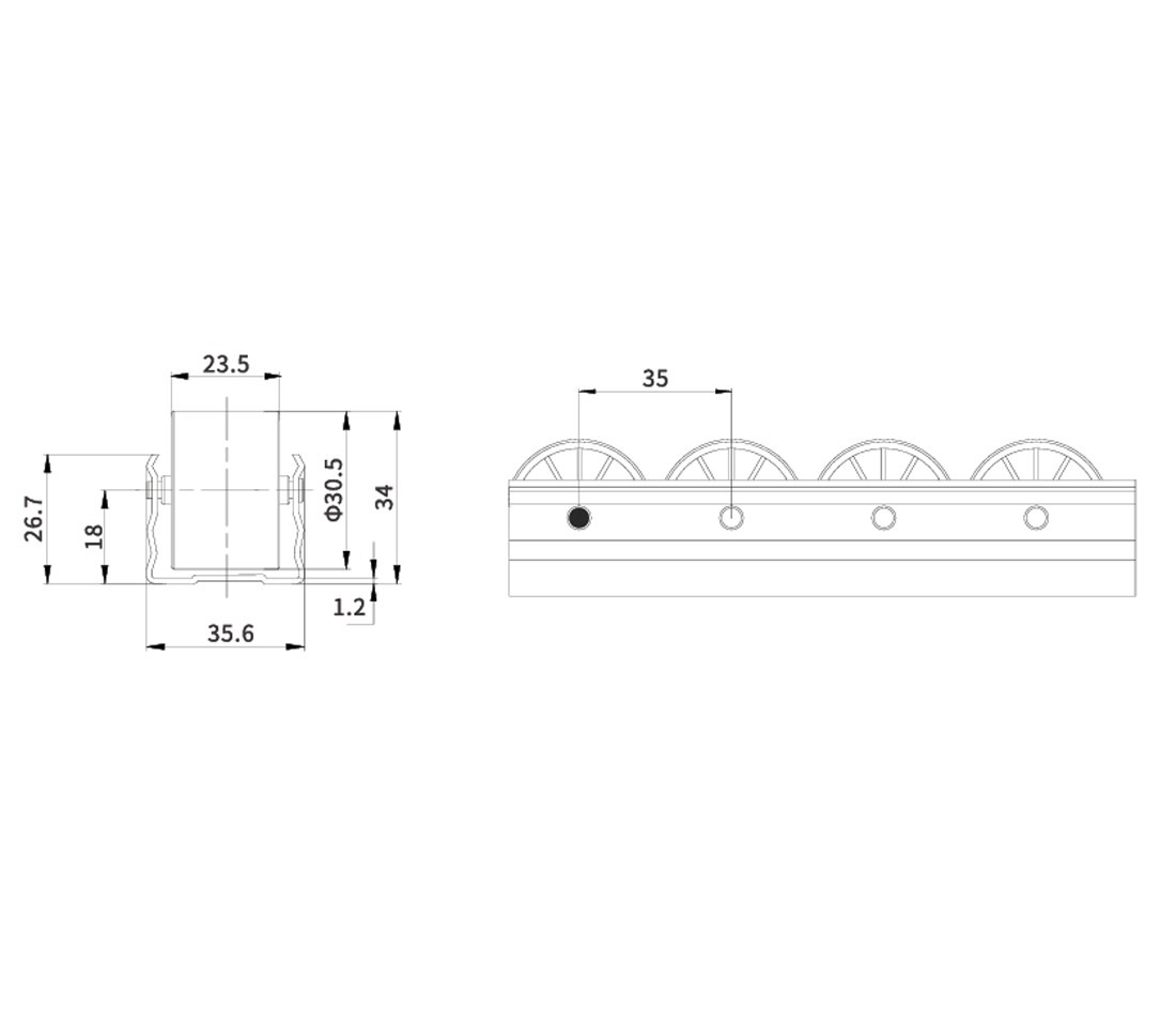 Так как межосевое расстояние между роликами 35 мм и диаметр ролика Ø30,5 мм края стальной направляющей могут быть без ролика.
