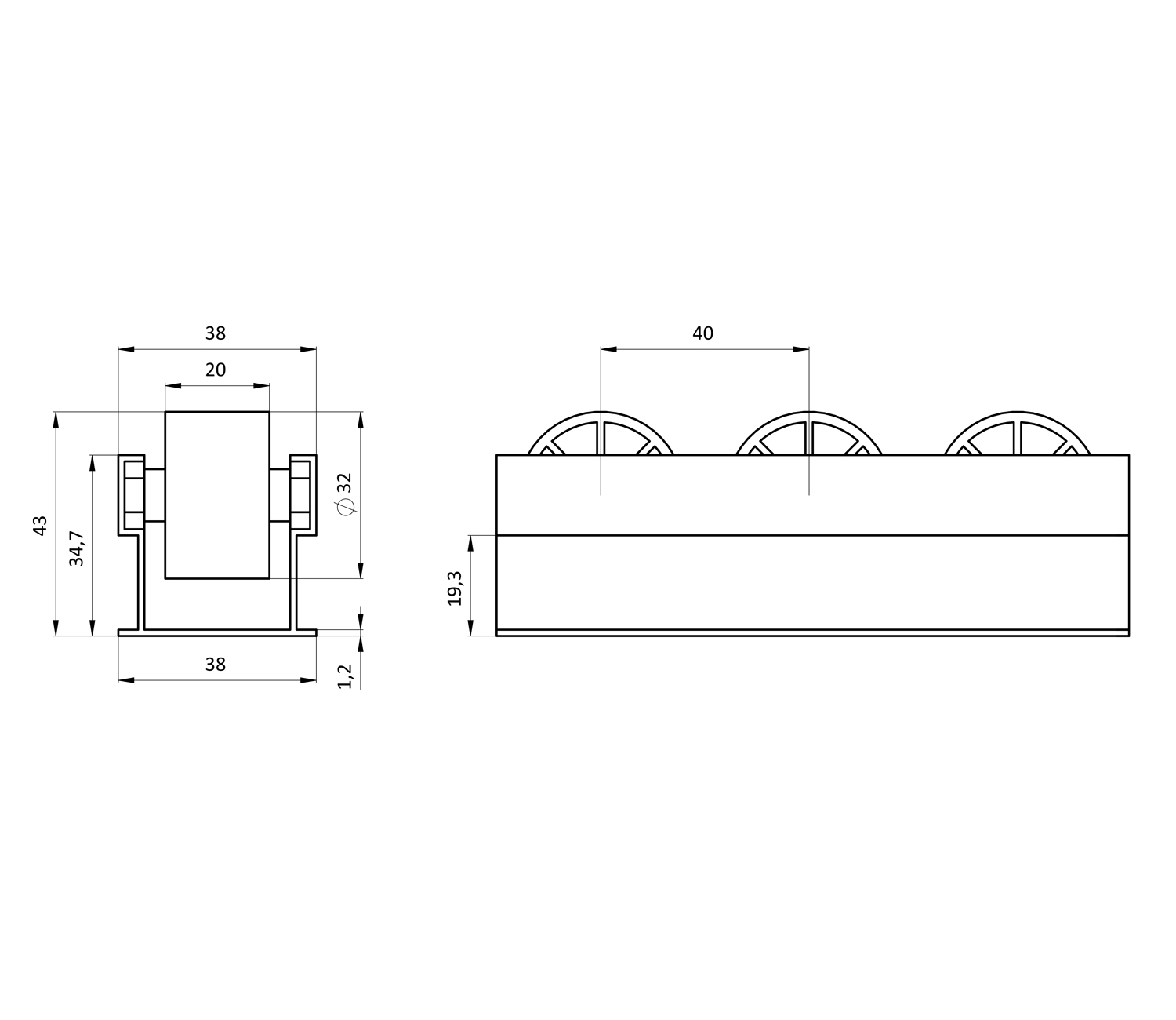 Роликовая направляющая (рольганг) представляет собой алюминиевое основание с пластиковыми колесами d32 мм на металлической оси.