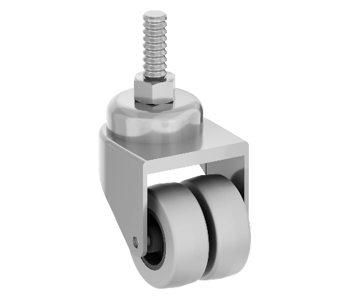 Сдвоенный ролик поворотный средней грузоподъемностью, имеет болт для крепления. Используется при производстве конструкций из алюминиевого профиля, которые должны обладать возможностью перемещения их в пространстве, такие как промышленная и рабочая мебель, тележки, различные агрегаты, торговое оборудование