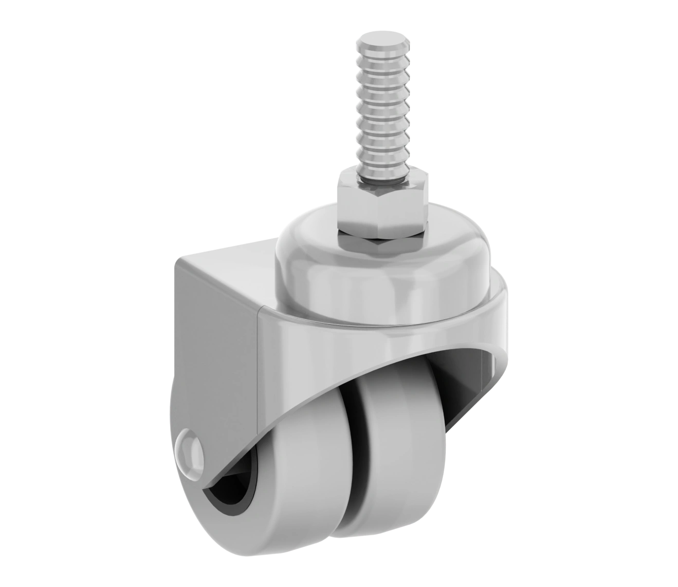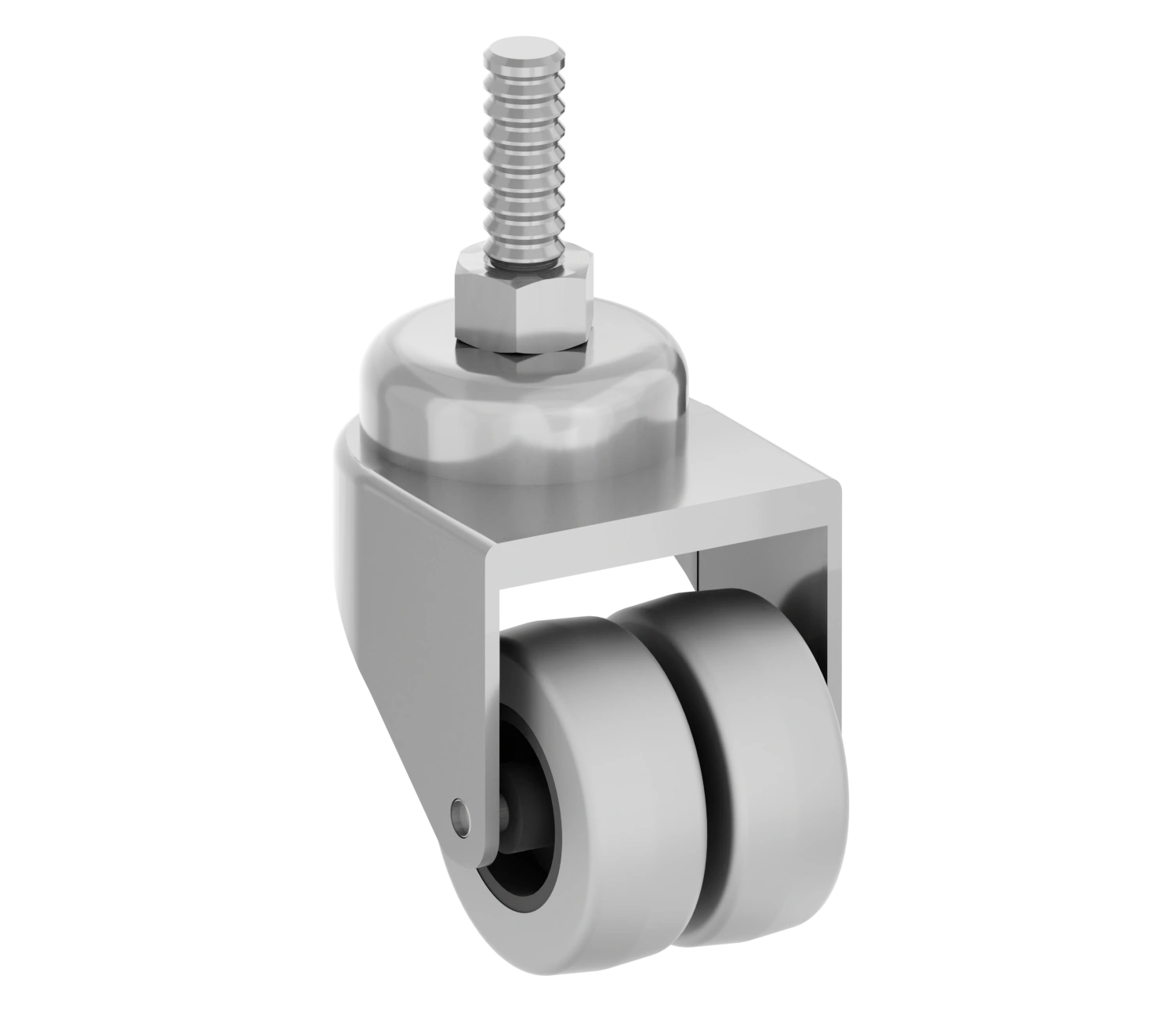 Сдвоенный ролик поворотный средней грузоподъемностью, имеет болт для крепления. Используется при производстве конструкций из алюминиевого профиля, которые должны обладать возможностью перемещения их в пространстве, такие как промышленная и рабочая мебель, тележки, различные агрегаты, торговое оборудование