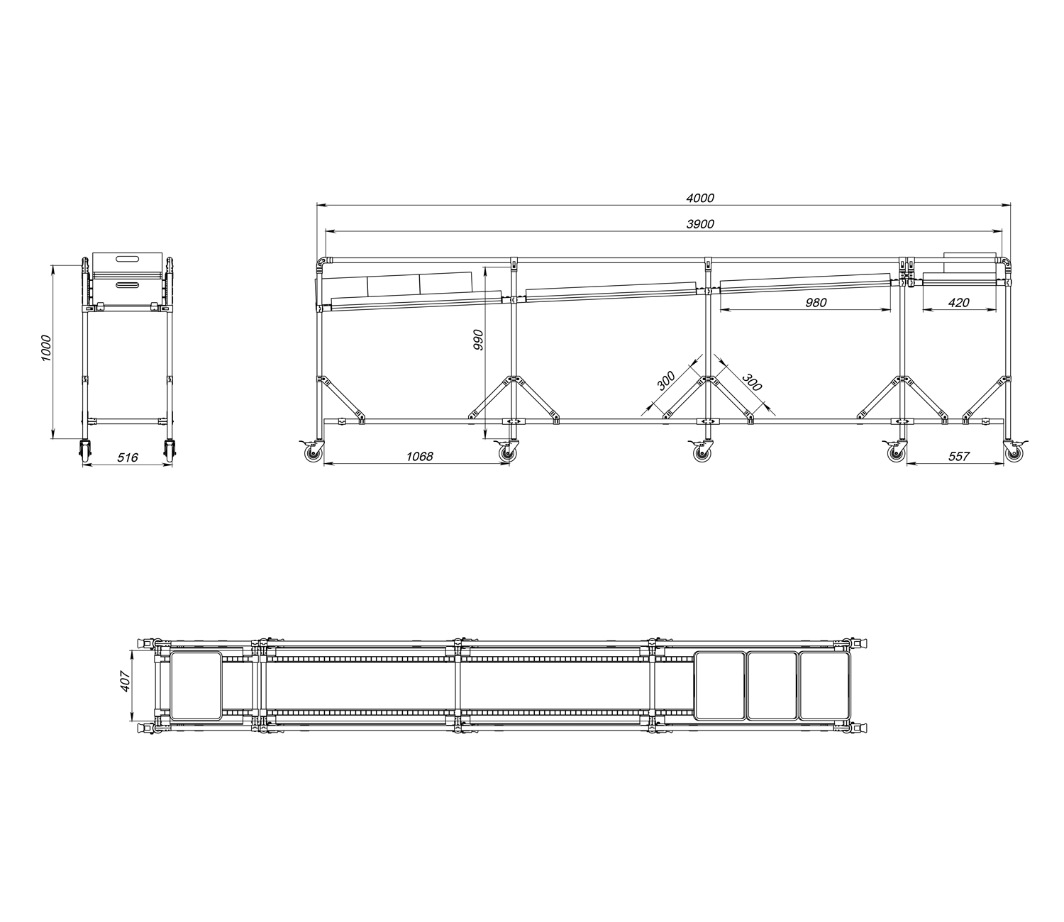Мобильный гравитационный модуль для организации конвейерных линий. Конструкция из алюминиевой трубы со стальными кронштейнами оснащена роликовыми направляющими для перемещения продукции в транспортировочных ящиках. Колеса с тормозной системой обеспечивают плавное перемещение и надежную фиксацию. Модуль может использоваться автономно или объединяться в протяженные линии.