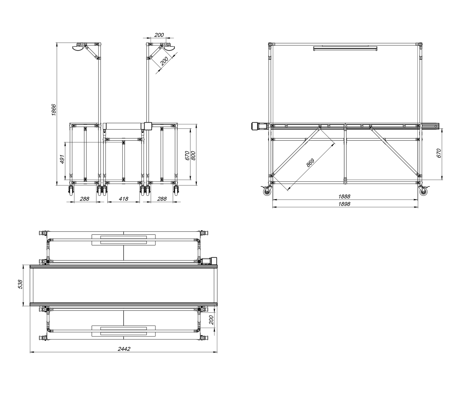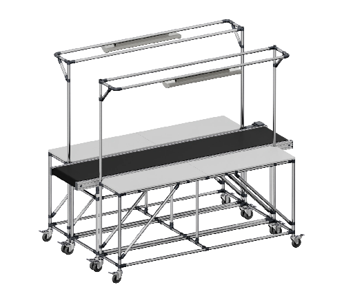 Модульный производственный комплекс с двумя рабочими зонами - диагностики и отбраковки грузоподъемностью до 25 кг каждая. Конструкция на основе алюминиевого профиля интегрирована с системой линейного перемещения продукции. Комплекс оснащен 12 колесами со стопорами для позиционирования в производственной линии.