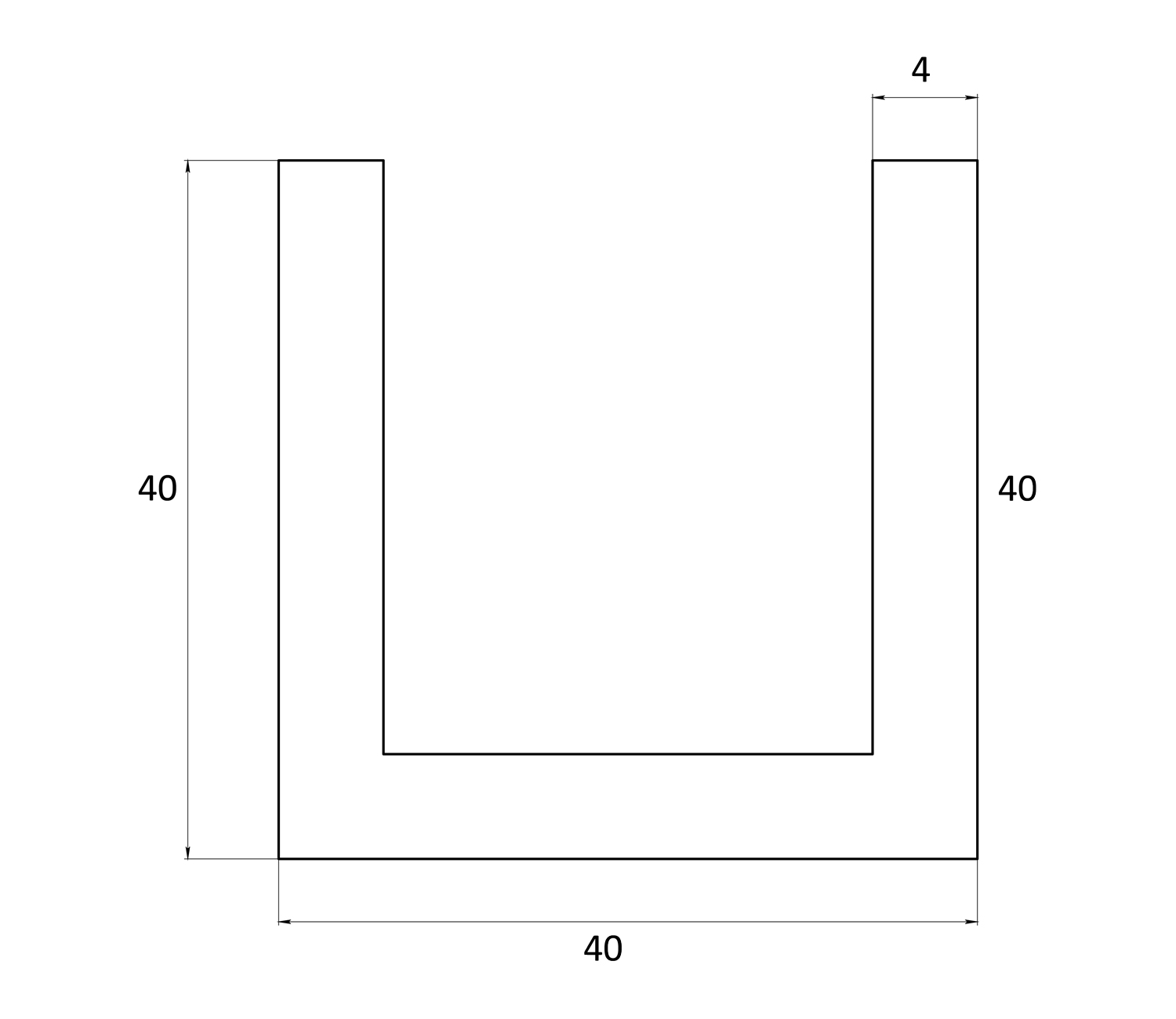 Алюминиевый швеллер сечением 40х40х40х4 мм представляет собой П-образный профиль и является идеальной заменой железным аналогам.
