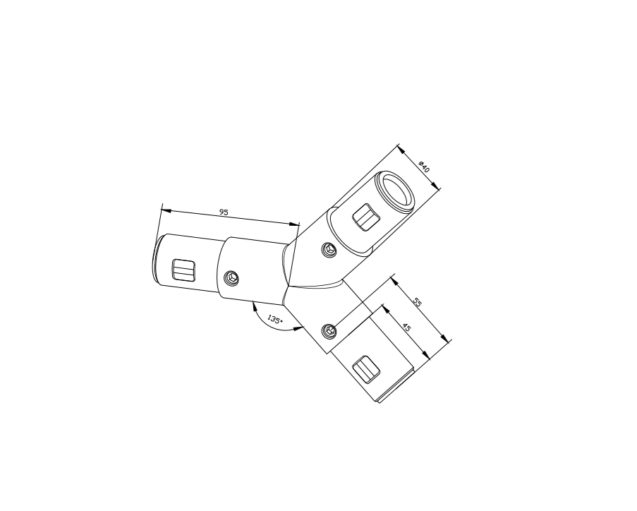 Соединяет трубный профиль с трех сторон, один угол при этом образует соединение под 135 градусов в таких элементах лестничной конструкции как поручни, ограждения.