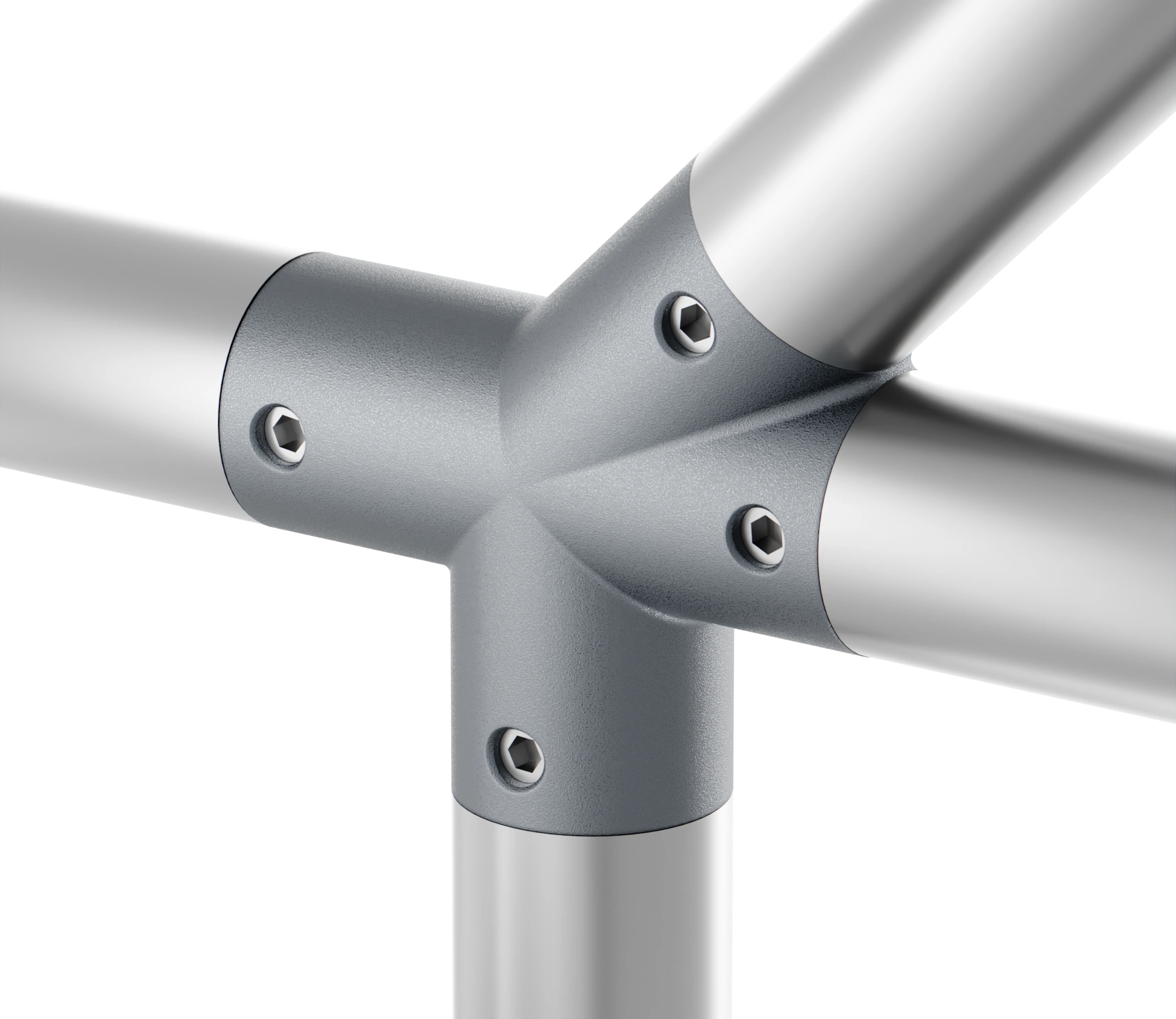 Соединяет трубный профиль с четырех сторон, один угол при этом образует соединение под 45 градусов в таких элементах лестничной конструкции как поручни, ограждения.
