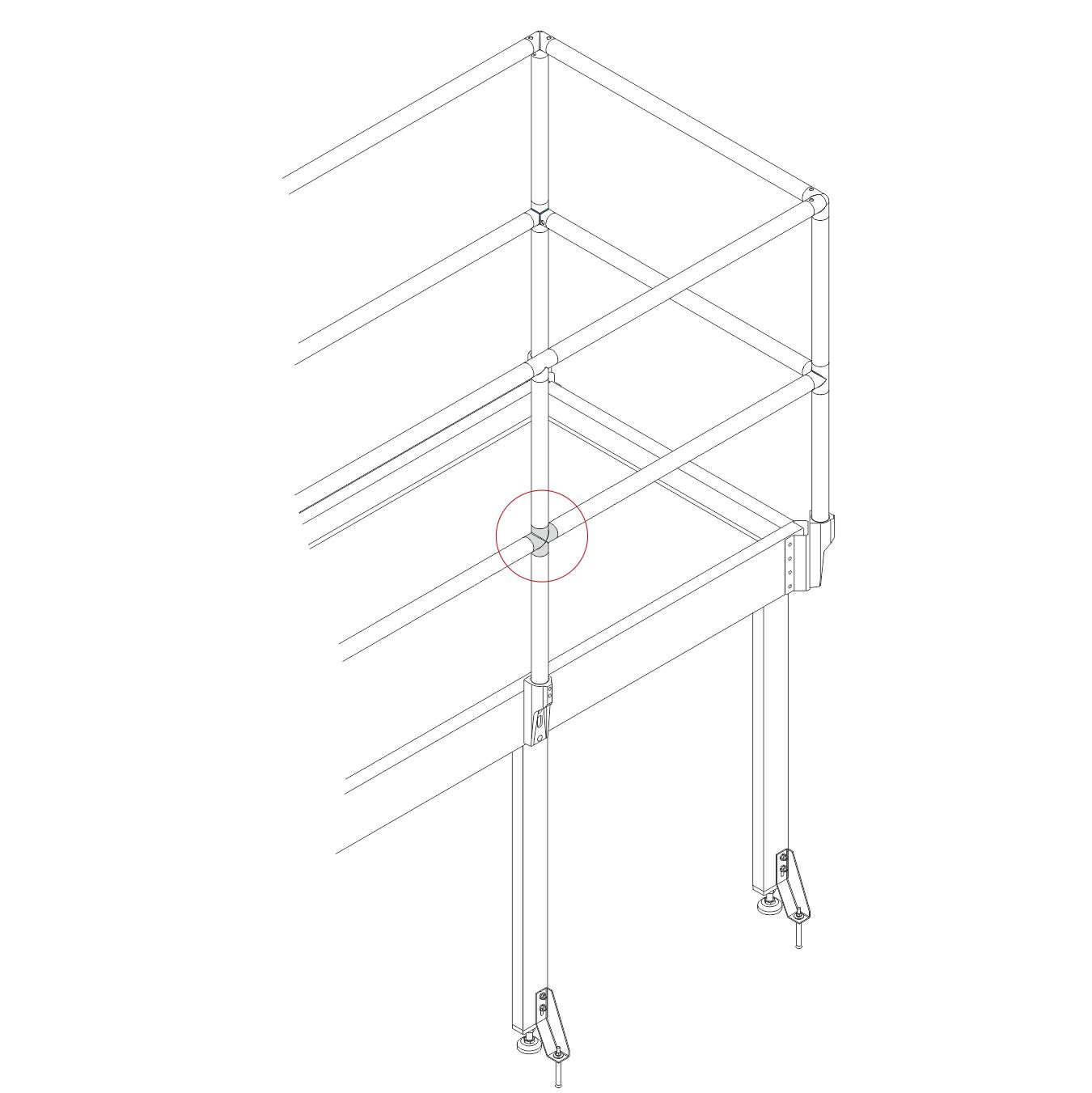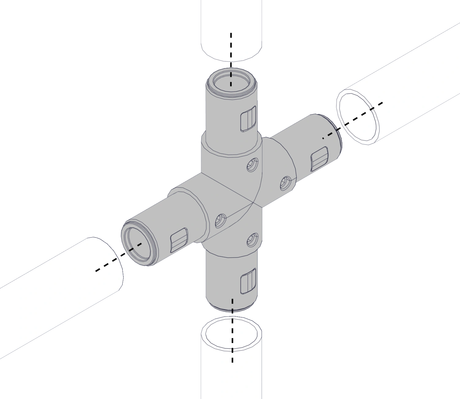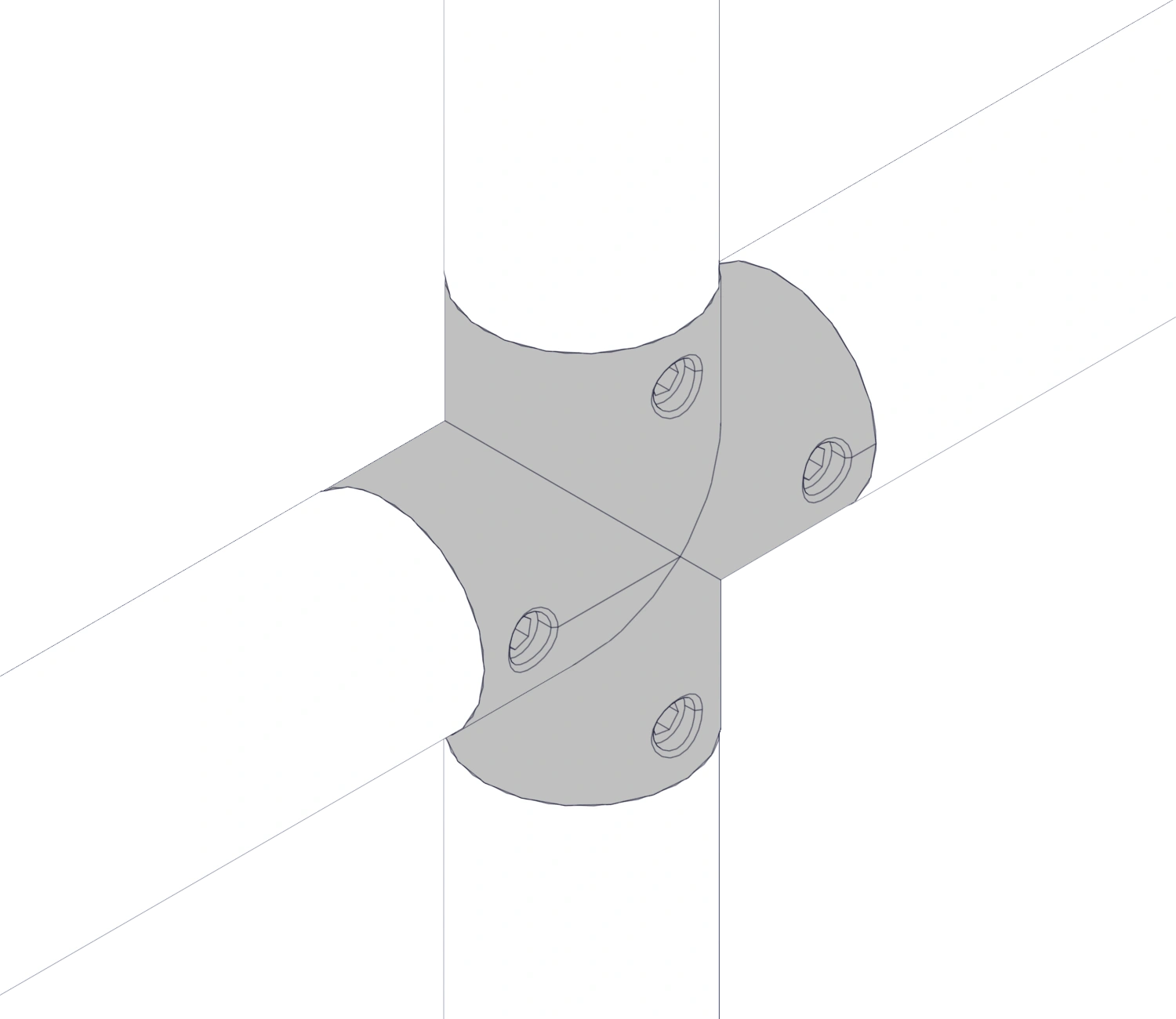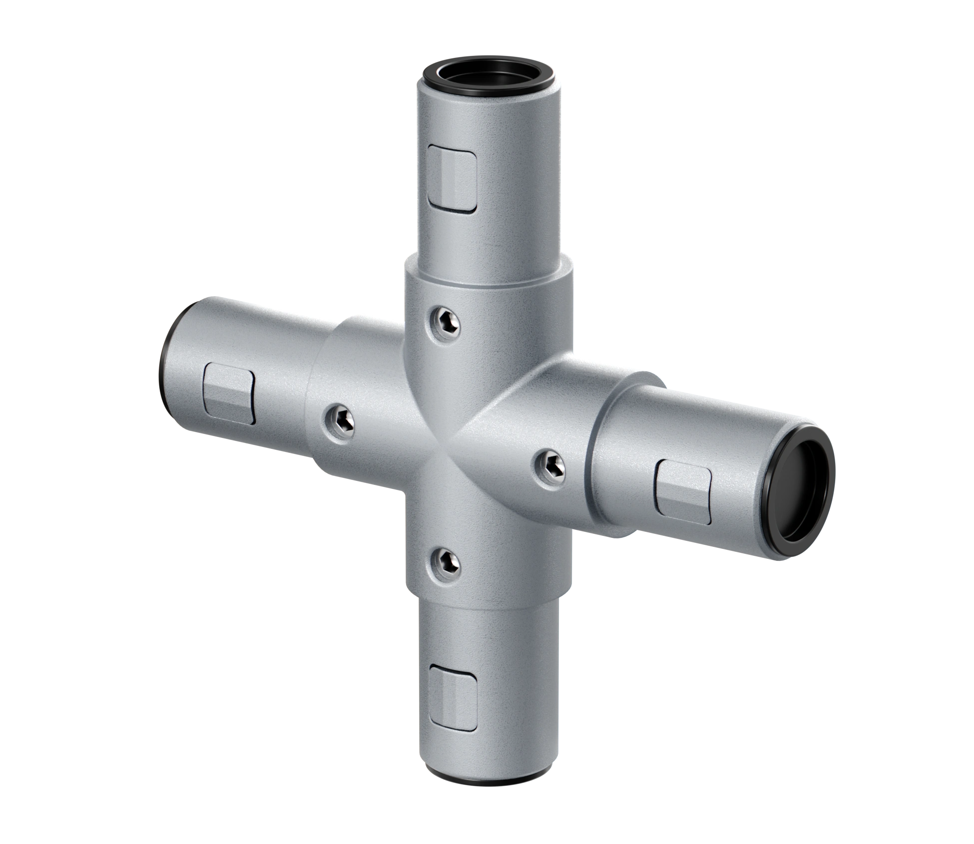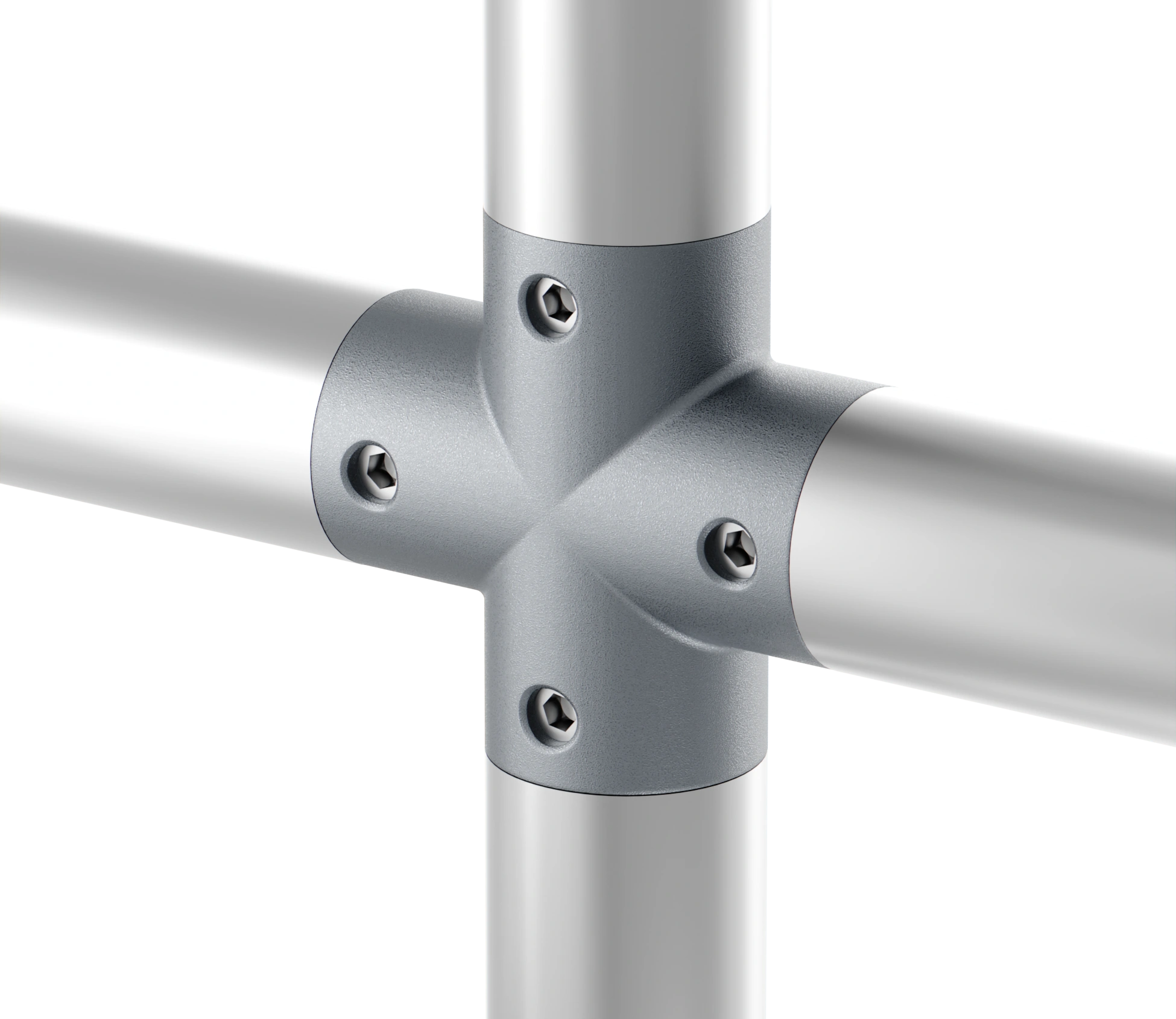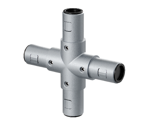 Соединяет трубный профиль с четырех сторон, все углы при этом образуют соединение под 90 градусов в таких элементах лестничной конструкции как поручни, ограждения.