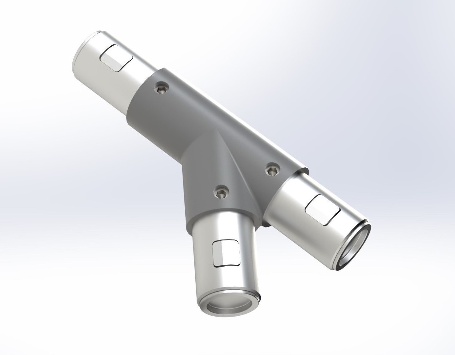 Соединяет трубный профиль с трех сторон, один угол при этом образует соединение под 45 градусов в таких элементах лестничной конструкции как поручни, ограждения.