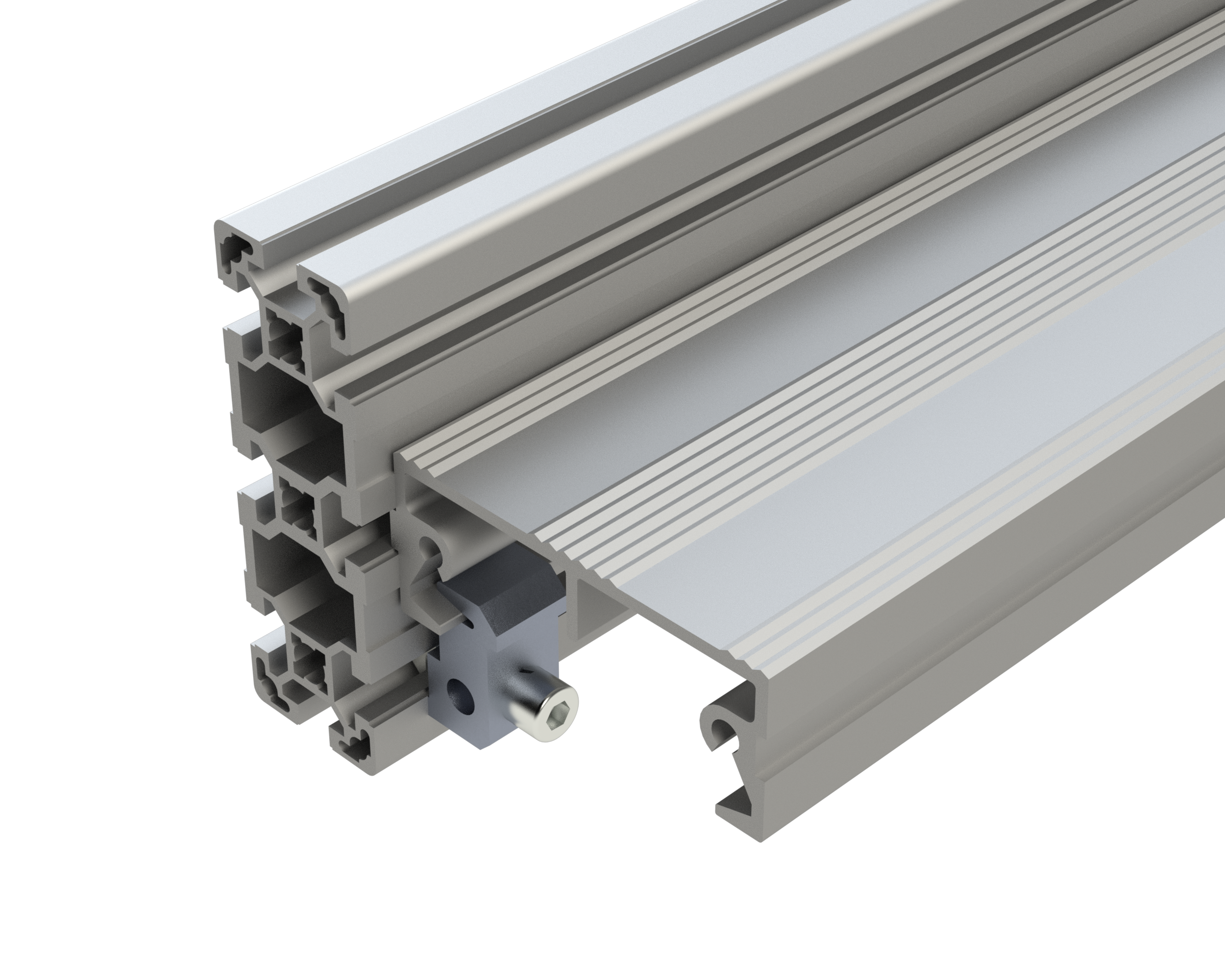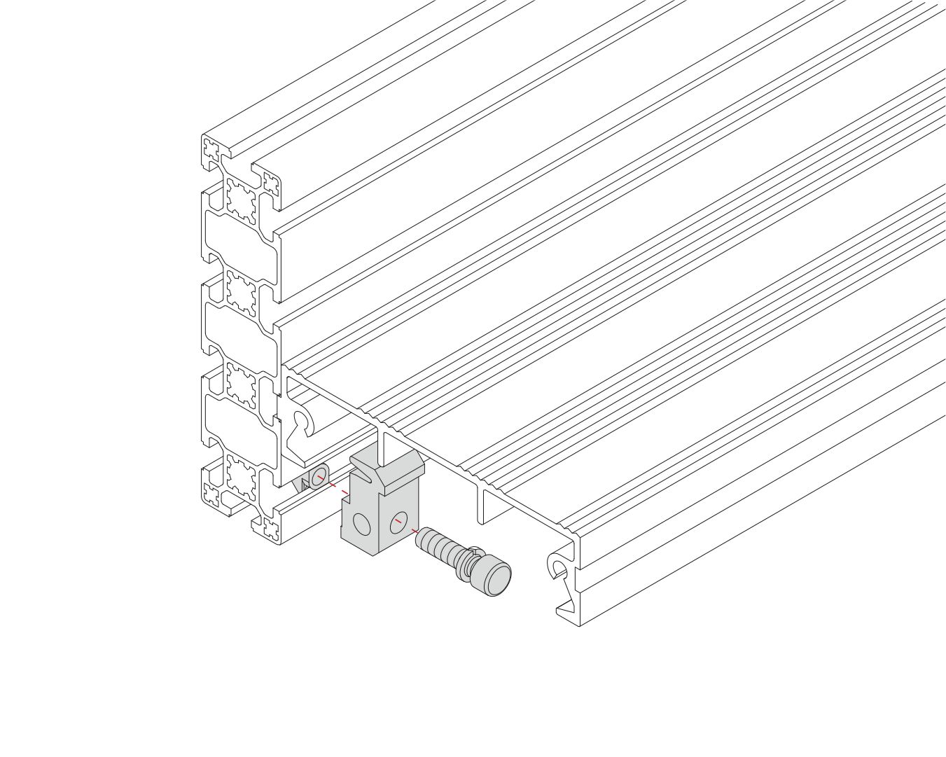 Устанавливается путем фиксации в паз профиля ступени и крепления к алюминиевому конструкционному профилю винтом и т-гайкой. Рекомендуется установка по длине из расчета 1 зажим на 300 мм профиля