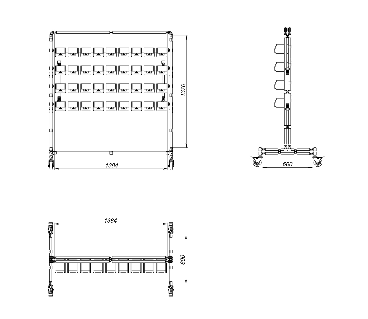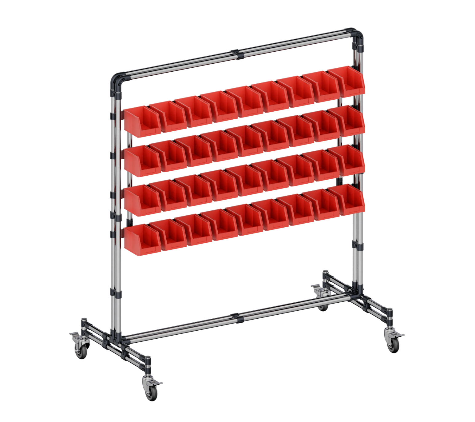 Мобильная стойка с 36 ячейками для хранения и перемещения метизов и мелких комплектующих. Конструкция из алюминиевой трубы обеспечивает устойчивость при нагрузке до 100 кг. Стойка оснащена четырьмя колесами с тормозами для перемещения между рабочими зонами. Эргономичная организация ячеек обеспечивает быстрый доступ к компонентам.