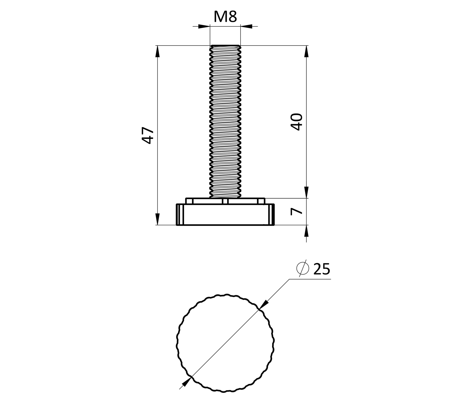 Опора регулируемая D25 М8 40 мм используется в устанавливаемых на пол конструкциях из алюминиевого конструкционного профиля