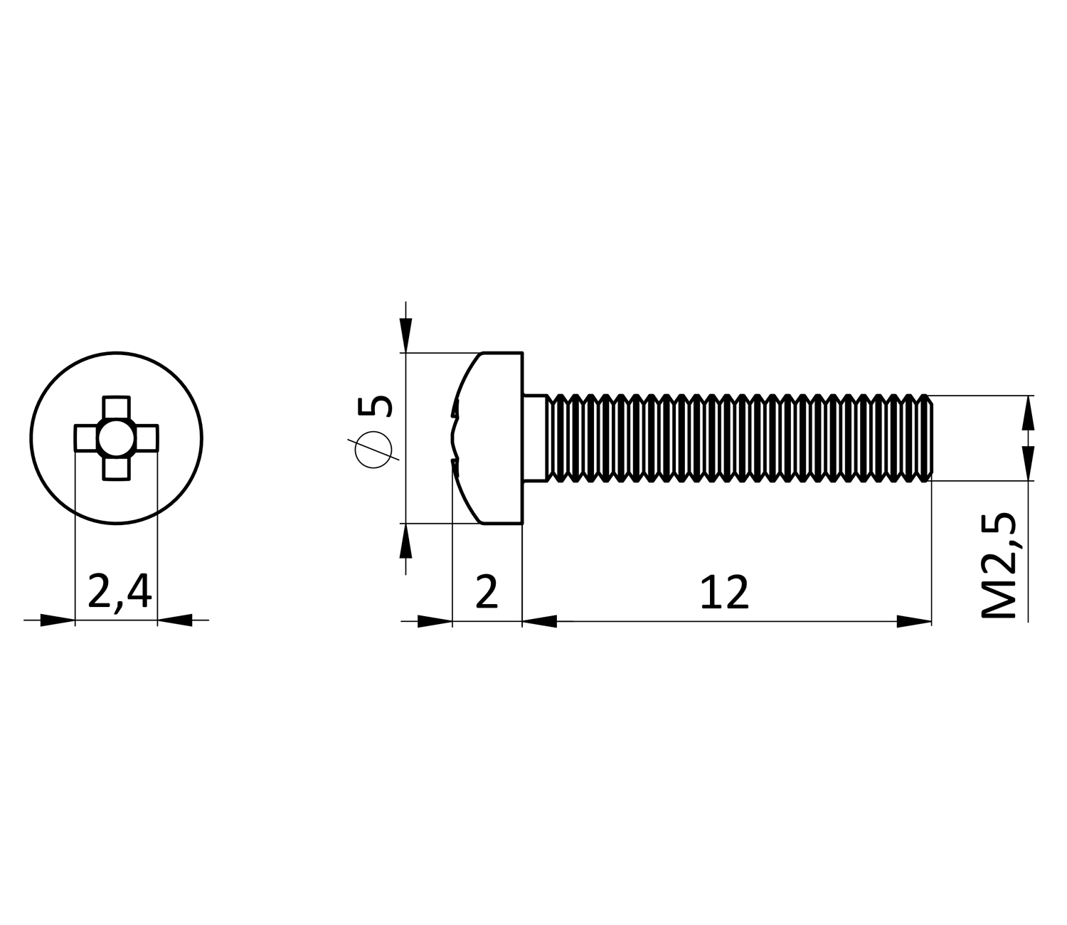 Винт DIN 7985 М2,5х12 имеет полную резьбу и полукруглую головку с крестообразным шлицем. Винт покрывают цинком, для того, чтобы защитить металл от воздействия внешних факторов и предотвратить ослабление или разрушение метиза из-за коррозии при использовании в условиях высокой влажности, а также придает характерный металлический блеск